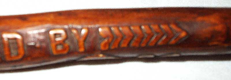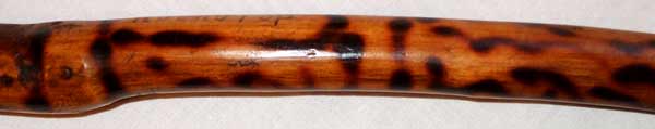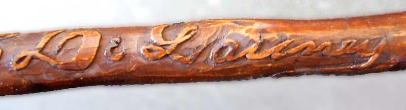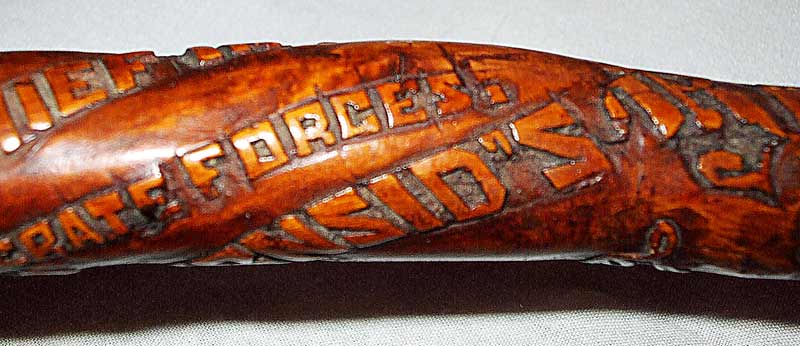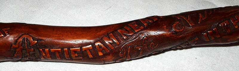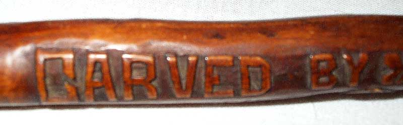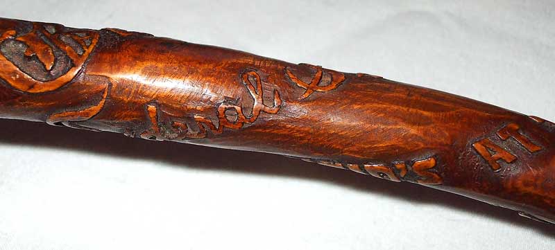 Here are the narrative ‘strands’ – Some start at the top of the cane (the large end), some toward the middle, and all strands work toward the bottom (the tip). All are carved in raised letters: some in ’block letters, others in cursive script and others in old English block style as indicated below.