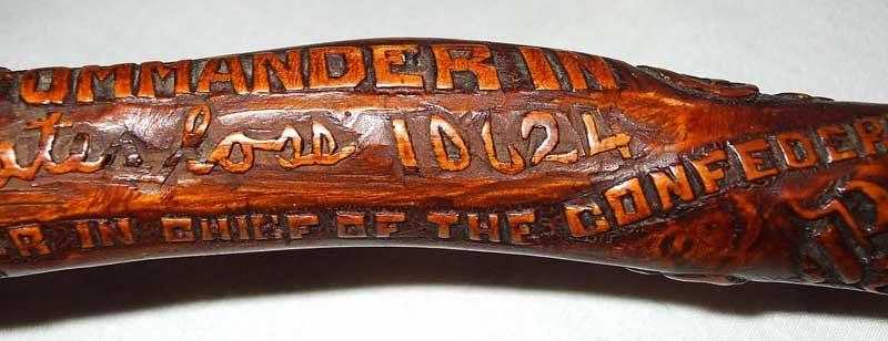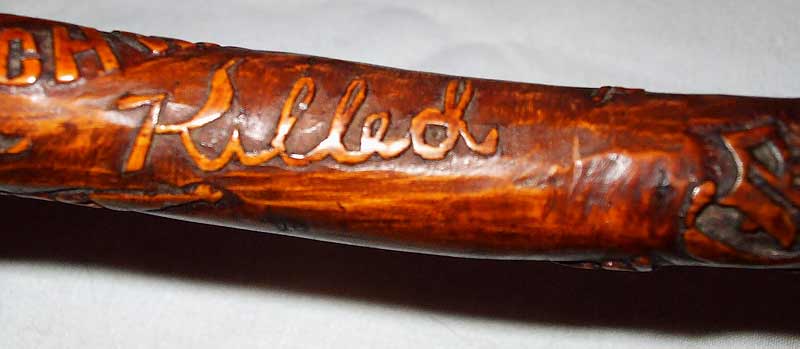 This is one of the walking canes that George brought back from the Civil War. It is intricately carved with information on the Battle on Antietam incuding the dates and numbers of soldiers killed and wounded. Note the shell used on the bottom of the cane.